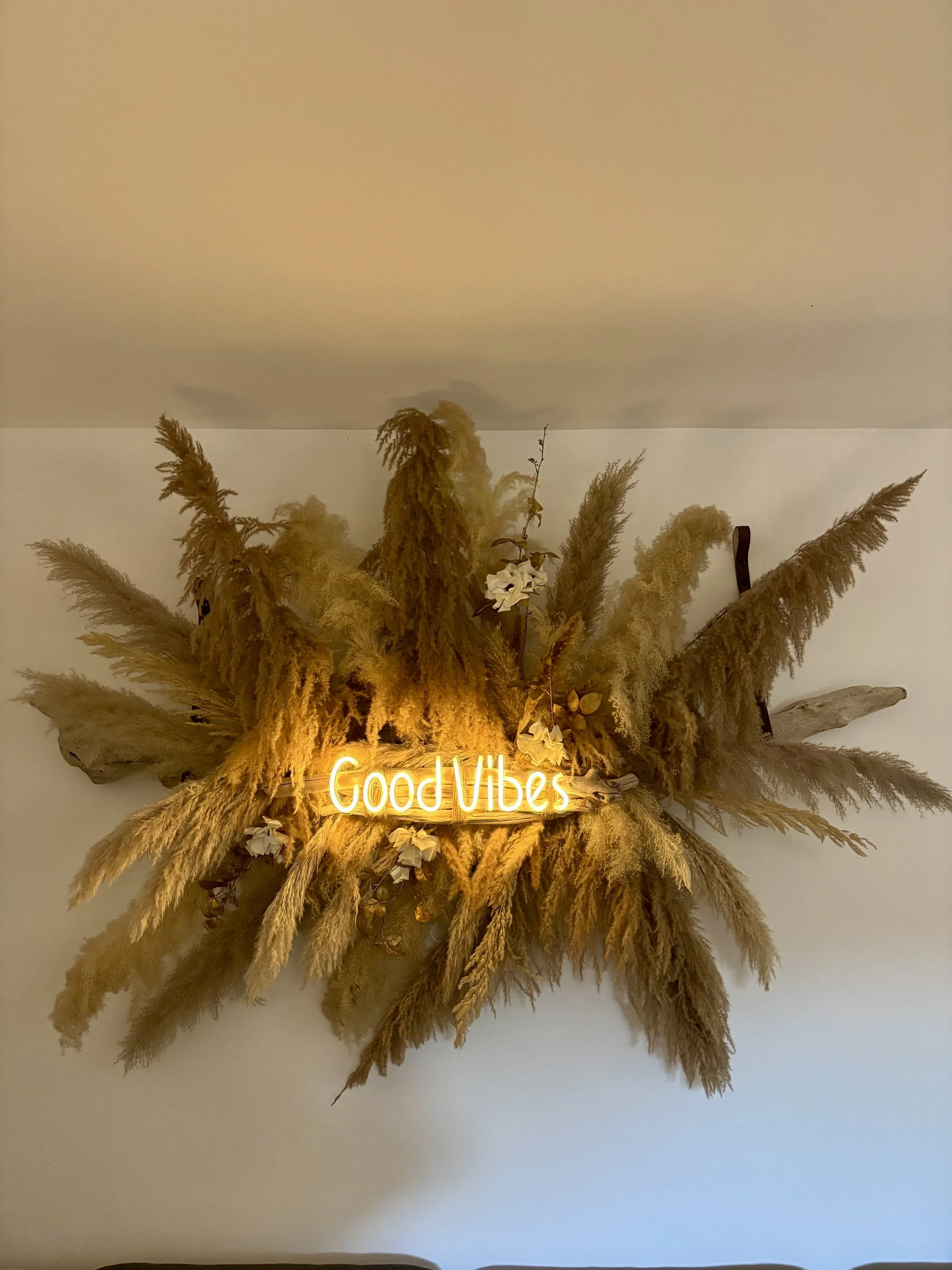 Entre douceur des pampas et éclat du néon, ce décor invite à la sérénité et aux ondes positives.